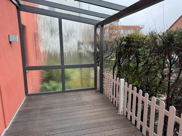 Der Wohn- und Essbereich ist modern offen gestaltet und bildet das Herzstück der Wohnung. Von hier aus gelangt man aud die großzügige Terrasse, die durch eine hochwertige, freistehende Aluminium-Glas-Konstruktion stilvoll überdacht ist. Ein weiteres Zimmer eignet sich ideal als Homeoffice, Gäste- oder Kinderzimmer.