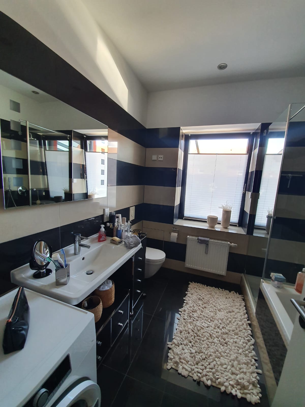 Das großzügige Badezimmer mit Fenster verfügt sowohl über Dusche als auch Badewanne und bietet entsprechend viel Komfort im Alltag. Ein praktischer Einbauschrank über 3 m Länge sorgt für zusätzlichen Stauraum und verbleibt in der Wohnung.
