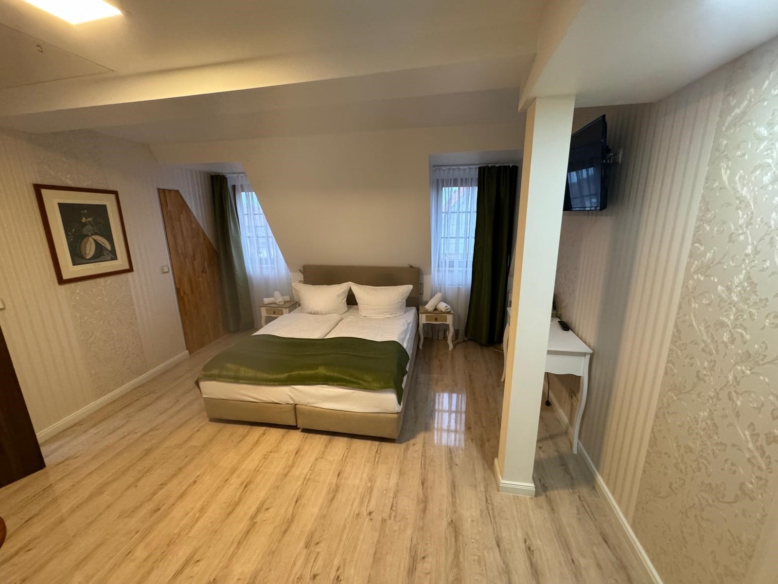 In dem denkmalgeschützten, 2014 - 2018 sanierten Gebäude in einem bekannten Ort Nahe Wolfsburg, befinden sich 16 hochwertig ausgestattete Ein- und Zweibettzimmer im modernen Traditionsstil. Dieses einzigartige Anwesen, welches 1739 im Spätbarock erbaut wurde, liegt direkt am schönen alten Markt und bietet einen freien Blick und ein sehr ruhiges Umfeld.