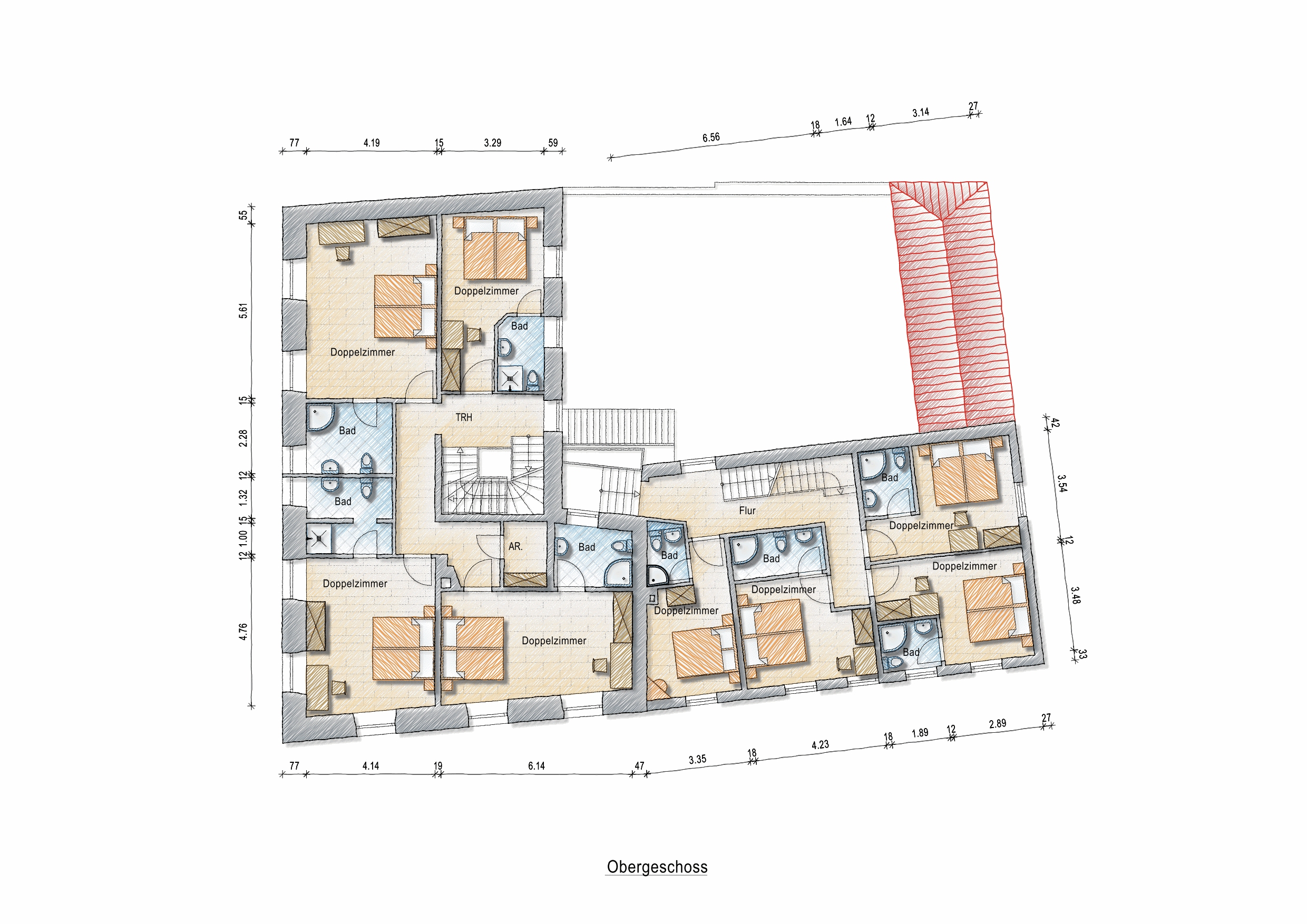 Die liebevoll eingerichteten Gästezimmer verfügen alle über ein eigenes Badezimmer, so dass die Nutzung auch für ein langfristiges Mietverhältnis ohne weiteres sofort gegeben wäre. Im Untergeschoss des Hauses erwartet die Gäste ein ansprechender Frühstücksraum. Ein weiterer Gastraum kann problemlos zum Konferenzraum oder für kleinere Events umgewandelt werden.